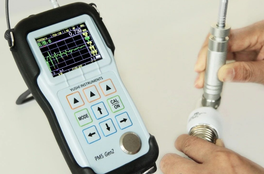 解決方案:我們使用宇時先鋒超聲波測厚儀PM5 Gen2搭配標配探頭或筆式延遲塊探頭進行測量(根據測量面曲率大小而定),筆式探頭尖窄的延遲塊端部與被測材料表面垂直時回波信號最大,測值最穩定。這時我們需要配合使用測試支架進行測試,測量穩定,回波清晰,測值準確,重復性好。也可以選擇定向捕捉或自動凍結功能讓測量更輕松、更快速。
