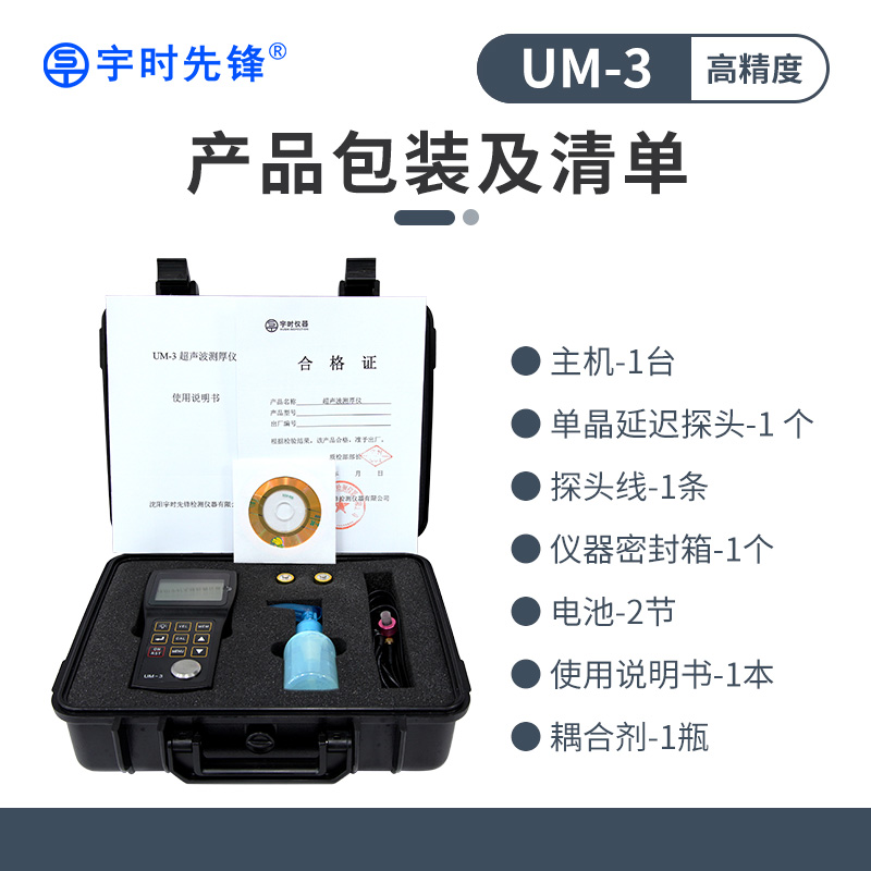 標準配置 | UM-3測厚儀、單晶探頭、儀器箱、兩節堿性電池、耦合劑、操作手冊、合格證、裝箱單 |