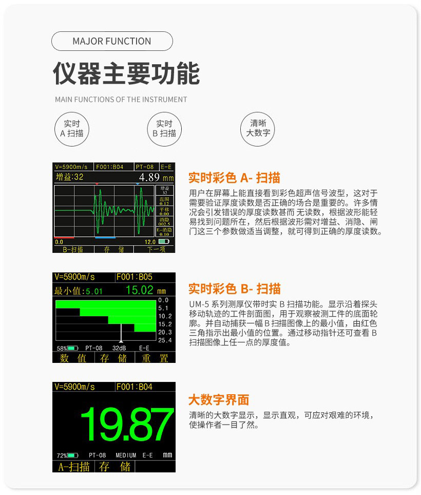 示值穩(wěn)定性 | 采用過零測量技術(shù),厚度測量值不受回波強(qiáng)度材料衰減系 數(shù)、增益和閘門高度的影響,具有較高測量穩(wěn)定性和準(zhǔn)確性。 |