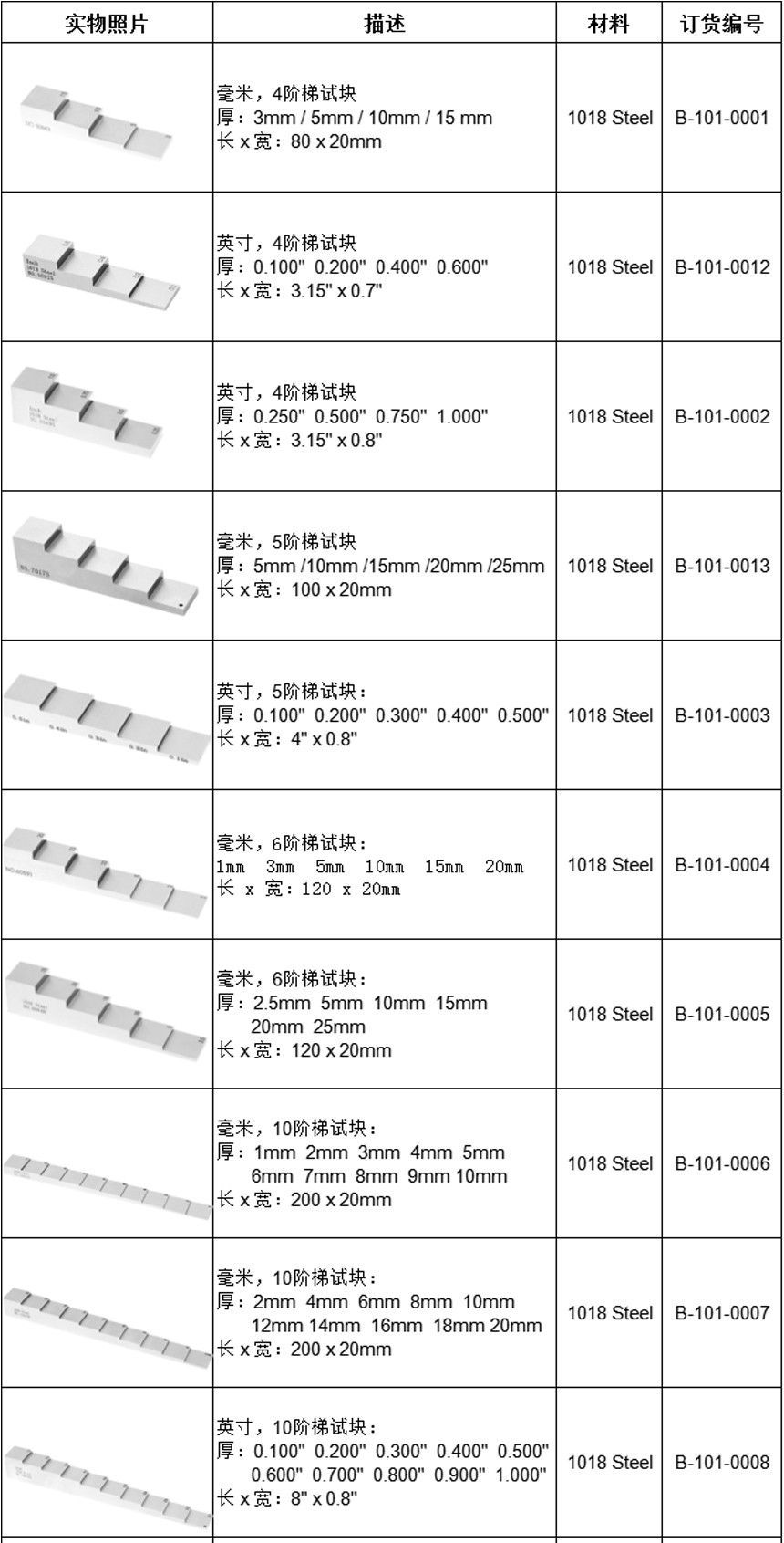 應用范圍:測厚試塊執(zhí)行GB/T 11344-2008無損檢測接觸式超聲脈沖回波測厚方法。試塊材質(zhì)有:碳鋼、不銹鋼、銅、鋁等。規(guī)格有:階梯方形、階梯半圓形、階梯扇形等。厚度單位:毫米、英寸。同時還有多種外形美觀的試塊包裝盒供您選擇。如有其他規(guī)格需求可定制!